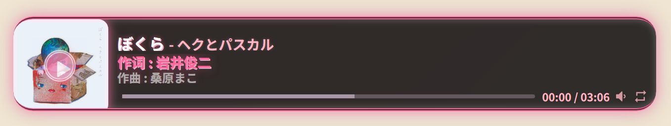 .aplayer.aplayer-withlist.aplayer-list-hide .aplayer-body { border-top: 3px double var(--primary-pink) !important; border-bottom: 3px double var(--primary-pink) !important; border-left: none !important; border-right: none !important; border-radius: var(--border-radius) !important; box-shadow: none !important; background: rgba(0, 0, 0, 0.8) !important; height: var(--player-height) !important; }